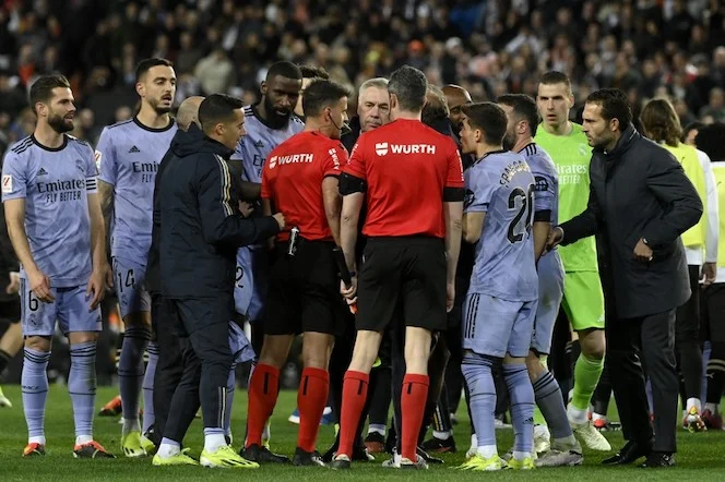 Spanish referee Jesus Gil Manzano talks with Real Madrid's Italian coach Carlo Ancelotti at the end of the Spanish league football match between Valencia CF and Real Madrid at the Mestalla stadium in Valencia on March 2, 2024 (Photo by JOSE JORDAN / AFP)