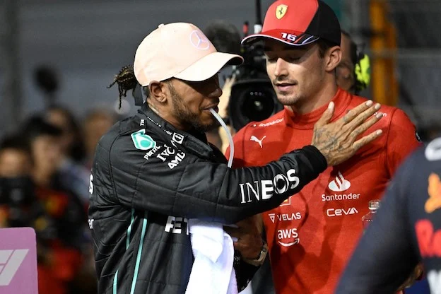 Mercedes' British driver Lewis Hamilton (L) greets Ferrari's Monegasque driver Charles Leclerc (R) after the qualifying session ahead of the Formula One Singapore Grand Prix night race at the Marina Bay Street Circuit in Singapore on October 1, 2022. (Photo by ROSLAN RAHMAN / AFP)