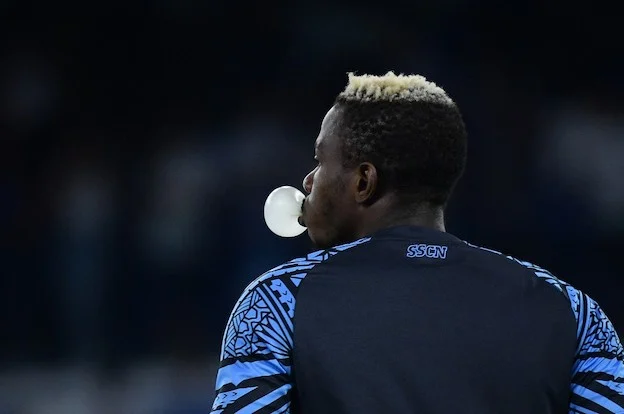Napoli's Nigerian forward #09 Victor Osimhen makes a bubble with a gum as he stands on the pitch before the Italian Serie A football match Napoli vs Sassuolo on August 27, 2023 at the Diego Armando Maradona stadium in Naples. (Photo by Filippo MONTEFORTE / AFP)