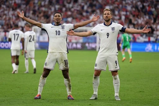 England's midfielder #10 Jude Bellingham celebrates with England's forward #09 Harry Kane after scoring his team's first goal during the UEFA Euro 2024 round of 16 football match between England and Slovakia at the Arena AufSchalke in Gelsenkirchen on June 30, 2024. (Photo by Adrian DENNIS / AFP)