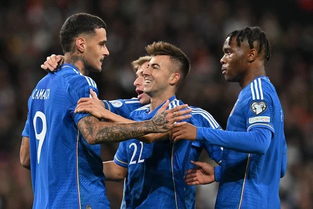 Italy's striker #09 Gianluca Scamacca celebrates with teammates after scoring his team first goal during the Euro 2024 qualifying group C football match between England and Italy at Wembley, in London, on October 17, 2023. (Photo by Glyn KIRK / AFP) / NOT FOR MARKETING OR ADVERTISING USE / RESTRICTED TO EDITORIAL USE