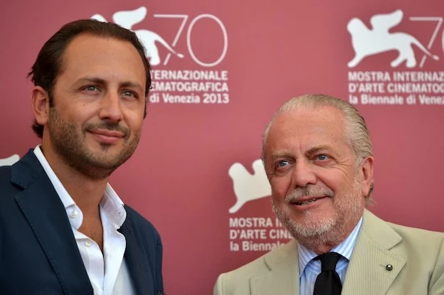 SSC Napoli football president Aurelio De Laurentiis and his son Luigi de Laurentiis pose during the photocall of "Il Terzo Tempo" presented in the Orizzonti selection at the 70th Venice Film Festival on August 31, 2013 at Venice Lido. AFP PHOTO / GABRIEL BOUYS (Photo by GABRIEL BOUYS / AFP)