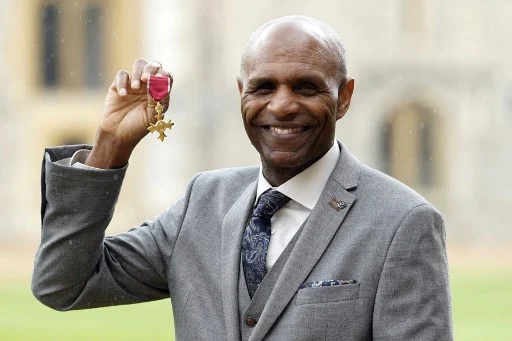 Former footballer Luther Blissett poses with their medal after being appointed an Officer of the Order of the British Empire (OBE) during an investiture ceremony at Windsor Castle on May 10, 2023. (Photo by Andrew Matthews / POOL / AFP)