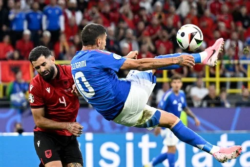 Albania's defender #04 Elseid Hisaj fights for the ball with Italy's midfielder #10 Lorenzo Pellegrini during the UEFA Euro 2024 Group B football match between Italy and Albania at the BVB Stadion in Dortmund on June 15, 2024. (Photo by INA FASSBENDER / AFP)