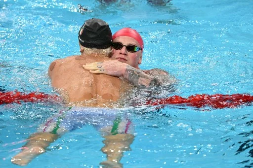 Italy's Nicolo Martinenghi (L) celebrates with Britain's Adam Peaty after winning the final of the men's 100m breaststroke swimming event during the Paris 2024 Olympic Games at the Paris La Defense Arena in Nanterre, west of Paris, on July 28, 2024. (Photo by Jonathan NACKSTRAND / AFP)