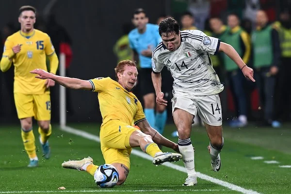Db Leverkusen (Germania) 20/11/2023 - qualificazione Euro 2024 / Ucraina-Italia / foto Daniele Buffa/Image Sport nella foto: Federico Chiesa-Juchym Konoplja