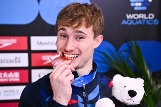 MONTREAL, CANADA - MARCH 03: Jack Laugher of Great Britain poses with his bronze medal after finishing third in the Men's 3m Springboard Final during the World Aquatics Diving World Cup at the Olympic Park Sports Centre on March 3, 2024 in Montreal, Quebec, Canada. Minas Panagiotakis/Getty Images/AFP (Photo by Minas Panagiotakis / GETTY IMAGES NORTH AMERICA / Getty Images via AFP)