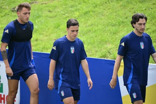 Italy's forward #11 Giacomo Raspadori (C) along with his teammates attend the MD-1 training session at their base camp in Iserlohn on June 23, 2024, on the eve of their UEFA Euro 2024 football match against Croatia. (Photo by Alberto PIZZOLI / AFP)