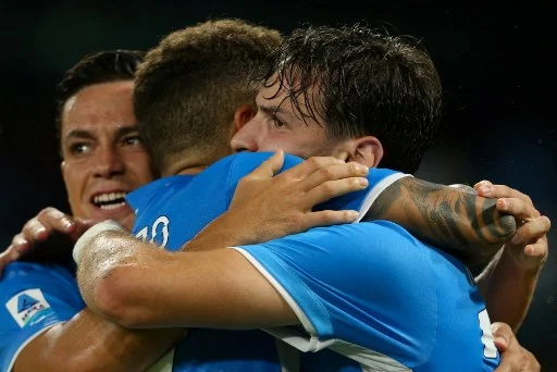 Napoli's Italian defender #22 Giovanni Di Lorenzo (C) celebrates with teammates Napoli's Georgian forward #77 Khvicha Kvaratskhelia (R) and Napoli's Italian forward #81 Giacomo Raspadori after scoring a goal during the Italian Serie A football match SSC Napoli against Bologna FC 1909, at the Diego Armando Maradona Stadium in Naples on August 25, 2024. (Photo by CARLO HERMANN / AFP)