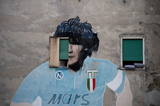 A mural of late Argentinian football legend Diego Maradona is pictured in the Quartieri Spagnoli district of Naples on March 16, 2023. - An incredible 18 points clear at the top of Serie A, it's surely only a matter of time until southern Italy's biggest club win the Scudetto for the first time since 1990, when Diego Maradona was still strutting his stuff in sight of Mount Vesuvius. (Photo by Tiziana FABI / AFP)