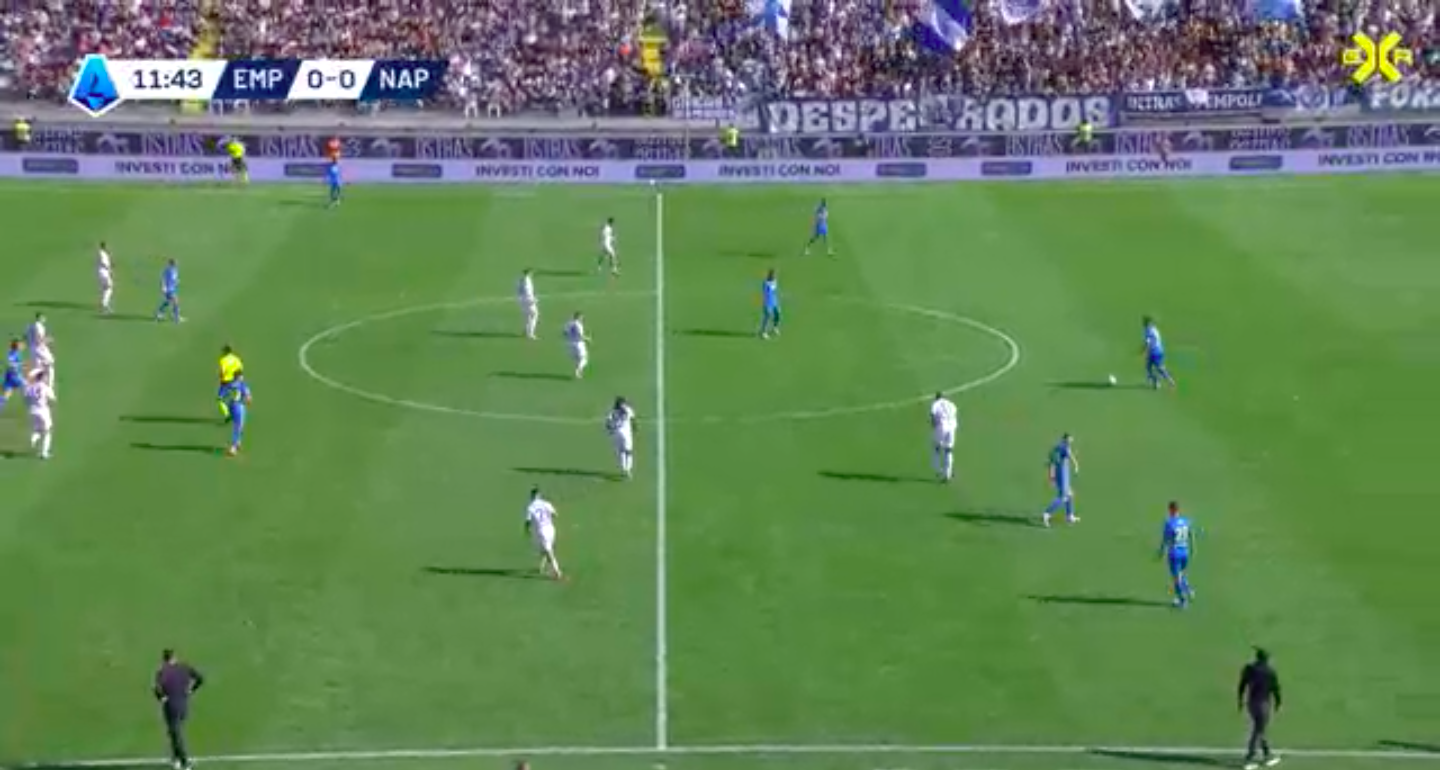 Nell’immagine che vedete sopra, si nota come l’Empoli fosse volutamente spezzato in due tronconi: cinque giocatori impostavano l’azione dal basso e altri cinque (l’esterno sinistro di D’Aversa, Pezzella, è fuori dall’inquadratura) si dividevano il fronte offensivo nella trequarti avversaria. Il lavoro chiave è stato quello dei due laterali a tutta fascia e dei due trequartisti: Gyasi e Pezzella garantivano ampiezza, costringendo Kvara e Politano a guardarsi le spalle, a rinculare; Fazzini ed Esposito, invece, si proponevano costantemente per ricevere il pallone tra le linee, alle spalle del centrocampo del Napoli.