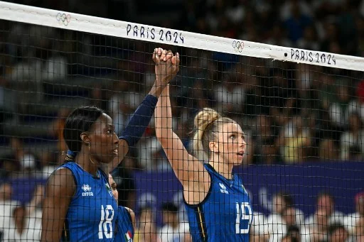 Italy's #18 Paola Ogechi Egonu (L) stands hand in hand with Italy's #19 Sarah Luisa Fahr prior to the volleyball women's quarter-final match between Italy and Serbia during the Paris 2024 Olympic Games at the South Paris Arena 1 in Paris on August 6, 2024. (Photo by PATRICIA DE MELO MOREIRA / AFP)