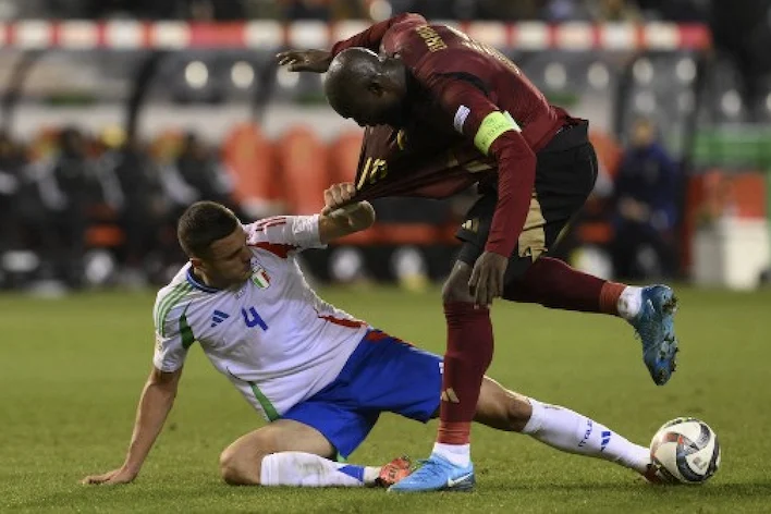 Belgium's forward #10 Romelu Lukaku fights for the ball with Italy's defender #04 Alessandro Buongiorno during the UEFA Nations League Group A2 football match between Belgium and Italy at the King Baudouin Stadium in Brussels on November 14, 2024. JOHN THYS / AFP