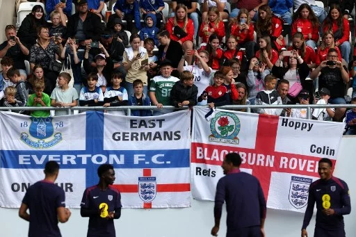 Fans gather as they watch England's team training session in Jena, eastern Germany on June 11, 2024, ahead of the UEFA Euro 2024 football championship. (Photo by Adrian DENNIS / AFP)