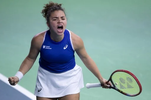 Italy's Jasmine Paolini celebrates beating Japan's Moyuka Uchijima during their quarter-finals singles tennis match between Japan and Italy at the Billie Jean King Cup Finals at the Palacio de Deportes Jose Maria Martin Carpena in Malaga, Spain, on November 16, 2024. (Photo by JORGE GUERRERO / AFP)