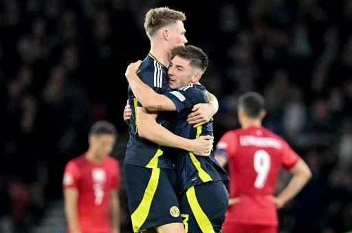 Scotland's midfielder #08 Billy Gilmour (R) celebrates with Scotland's midfielder #04 Scott McTominay after scoring the team's first goal during the UEFA Nations League League A Group 1 football match between Scotland and Poland, at Hampden Park stadium, in Glasgow, on September 5, 2024. (Photo by ANDY BUCHANAN / AFP)