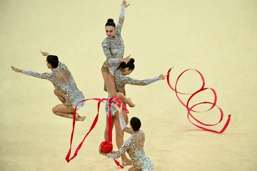 Italy's gymnasts perform with ribbons and balls as they compete in the rhytmic gymnastics' group all-around qualification during the Paris 2024 Olympic Games at the Porte de la Chapelle Arena in Paris, on August 9, 2024. (Photo by Loic VENANCE / AFP)