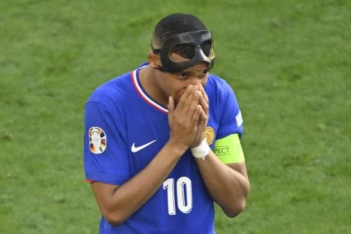 France's forward #10 Kylian Mbappe holds his nose after removing his protective mask during to the UEFA Euro 2024 Group D football match between France and Poland at the BVB Stadion in Dortmund on June 25, 2024. (Photo by INA FASSBENDER / AFP)
