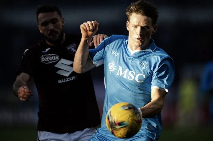 Napoli's Scottish midfielder #08 Scott McTominay (R) controls the ball during the Italian Serie A football match between Torino FC and SSC Napoli at the Grande Torino Stadium in Turin on December 1, 2024. MARCO BERTORELLO / AFP