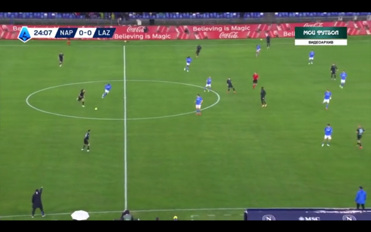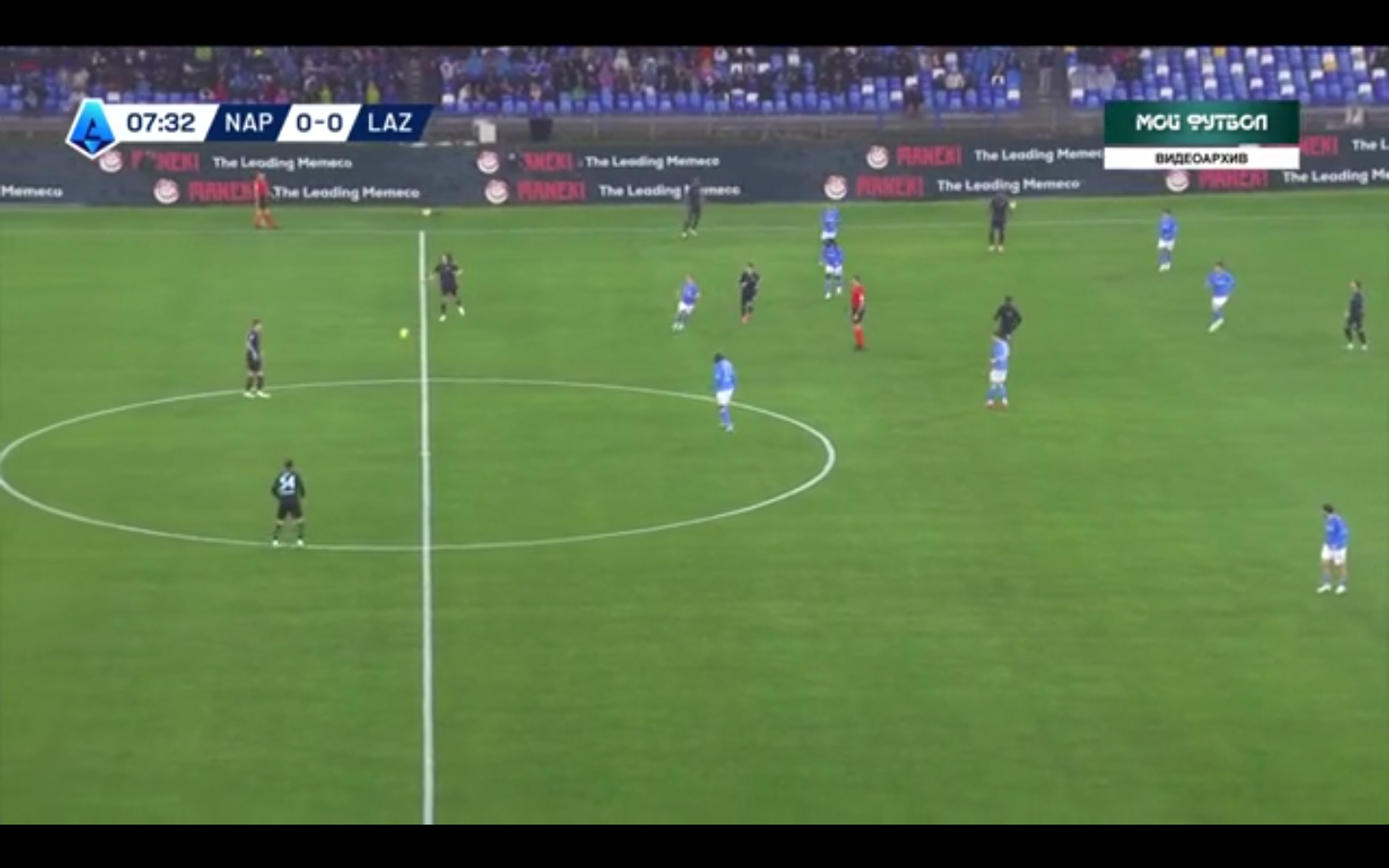 La Lazio, come si vede da questi screen, in realtà ha utilizzato il 4-4-2 solo in fase di non possesso. La squadra di Baroni, nei momenti in cui doveva costruire gioco, si è disposta con un una sorta di 3-3-1-3: Guendouzi si abbassava sulla linea dei difensori centrali per impostare, i due esterni bassi (Marusic e Tavares) si alzavano con Dele-Bashiru a dare supporto da ambo i lati; Dia era l’uomo tra le linee dietro il tridente composto da Isaksen, Castellanos e Zaccagni. Il Napoli ha provato a rispondere, almeno nei primi minuti di gioco, esasperando il concetto di marcatura a uomo. Sotto ci sono un paio di frame in cui vediamo degli accoppiamenti a tutto campo in fase di pressing, soprattutto sulla prima costruzione della squadra di Baroni.