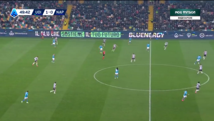 In questo caso specifico, l’ennesima azione costruita dal basso e che si sviluppa su una fascia, in particolare quella sinistra, finisce per aprire uno spazio. Perché l’Udinese porta tanti uomini in pressione, ma i giocatori del Napoli mandano a vuoto questa aggressività, fanno girare velocemente la sfera e sono rapidi – con le gambe, ma anche con la testa – quando intervengono sui palloni contesi. Quelli definiti mezzi e mezzi, dagli addetti ai lavori.