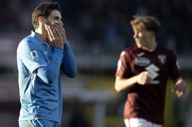Napoli's Georgian forward #77 Khvicha Kvaratskhelia (L) reacts during the Italian Serie A football match between Torino FC and SSC Napoli at the Grande Torino Stadium in Turin on December 1, 2024. MARCO BERTORELLO / AFP