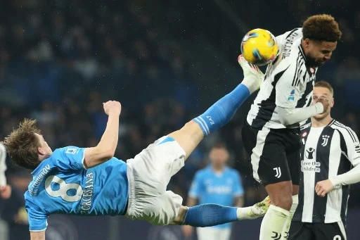 Napoli's Scottish midfielder #08 Scott Mc Tominay fights for the ball with Juventus' American midfielder #16 Weston McKennie during the Italian Serie A football match between Napoli and Juventus at the Diego Armando Maradona stadium in Naples on January 25, 2025. (Photo by Carlo Hermann / AFP)