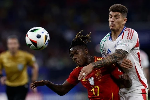 Spain's midfielder #17 Nico Williams and Italy's defender #02 Giovanni Di Lorenzo (R) go for a header during the UEFA Euro 2024 Group B football match between Spain and Italy at the Arena AufSchalke in Gelsenkirchen on June 20, 2024. (Photo by KENZO TRIBOUILLARD / AFP)