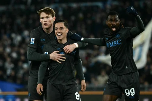 Napoli's Scottish midfielder #08 Scott Mc Tominay, Napoli's Italian forward #81 Giacomo Raspadori and Napoli's Cameroon midfielder #99 Andre Zambo Anguissa celebrate their team's second goal after Lazio's Montenegrin defender #77 Adam Marusic autogoal during the Italian Serie A football match between Lazio and Napoli at the Olympic Stadium in Rome on February 15, 2025. (Photo by Filippo MONTEFORTE / AFP)