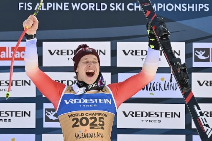 Winner Switzerland's Marco Odermatt celebrates on the podium after the Men's Super-G event of the Saalbach 2025 FIS Alpine World Ski Championships in Hinterglemm on February 7, 2025. KERSTIN JOENSSON / AFP