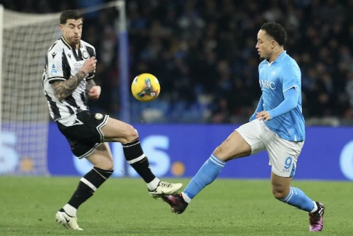 Napoli's Swiss forward #9 Noah Okafor (R) fights for the ball with Udinese's Argentine midfielder #05 Martin Payero (L) during the Italian Serie A football match between Napoli and Udinese at the Diego Armando Maradona Stadium in Naples on February 9, 2025. CARLO HERMANN / AFP
