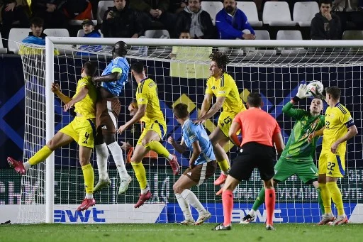 Belgium's forward #10 Romelu Lukaku (2L) scores the opening goal during the UEFA Nations League play-off first leg football match between Ukraine and Belgium at Enrique Roca stadium in Murcia, on March 20, 2025. (Photo by JOSE JORDAN / AFP)