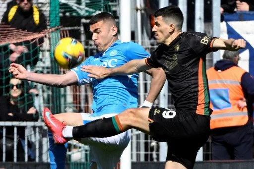 Venezia's Bosnian forward Mirko Mari? (R) fights for the ball with Napoli's Italian defender #04 Alessandro Buongiorno during the Italian Serie A football match between Venezia and Napoli at the Pier Luigi Penzo Stadium, on March 23, 2025 in Venice. (Photo by ANDREA PATTARO / AFP)