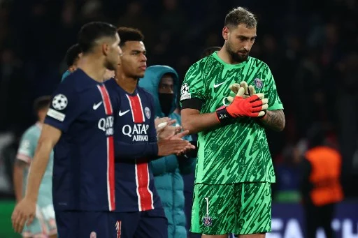 Paris Saint-Germain's Italian goalkeeper #01 Gianluigi Donnarumma looks down after loosing the UEFA Champions League, League phase - Matchday 4, football match between Paris Saint-Germain (PSG) and Atletico Madrid, at the Parc des Princes stadium in Paris on November 6, 2024. (Photo by Anne-Christine POUJOULAT / AFP)