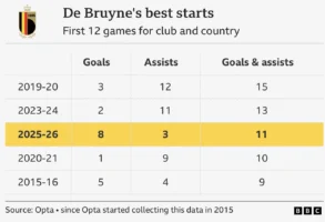 De Bruyne ha iniziato il 2025-26 in splendida forma, sottolineato dai due gol su rigore nella vittoria 4-2 del Belgio contro il Galles ieri sera. Scrive la Bbc:
