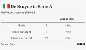 Nonostante quell’episodio, l’inizio di stagione 2025-26 di De Bruyne suggerisce che sarebbe potuto ancora essere una figura chiave nella squadra di Pep Guardiola e, se confrontato con l’attuale rosa di centrocampisti e ali del City, solo il connazionale Jeremy Doku si avvicina ai suoi numeri di gol e assist”.
