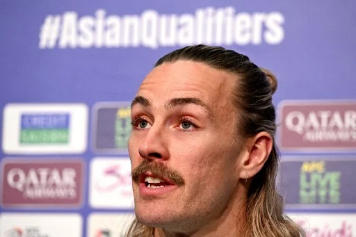 Australia's Jackson Irvine speaks to the media in Melbourne on November 13 2024, ahead of the 2026 World Cup Asian qualification football match against Saudi Arabia on November 14. (Photo by DAVID GRAY / AFP)