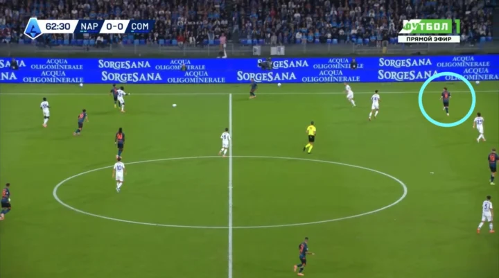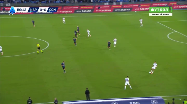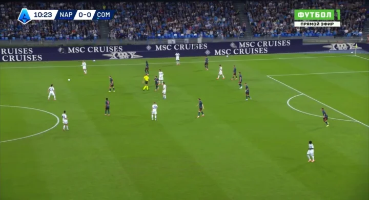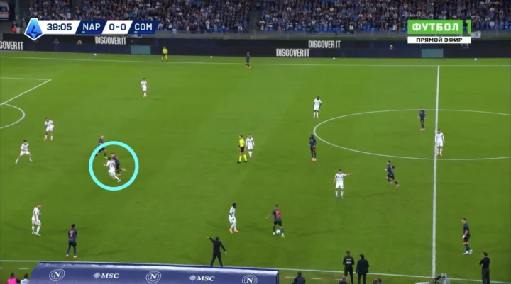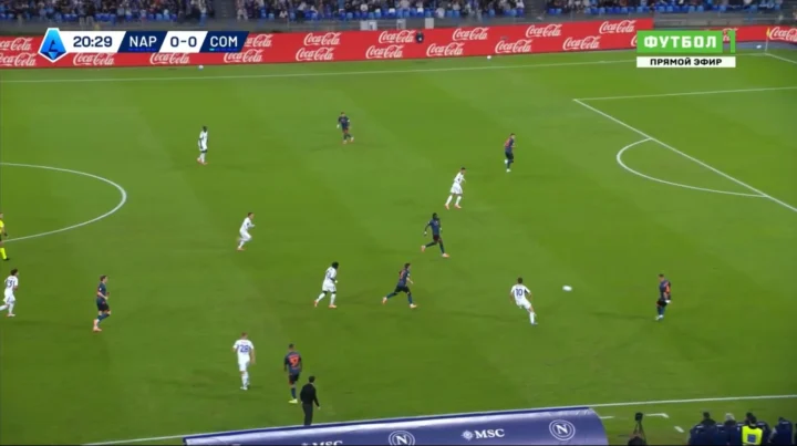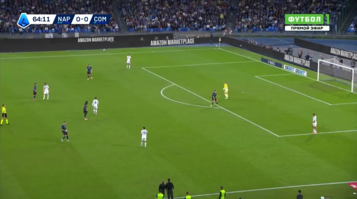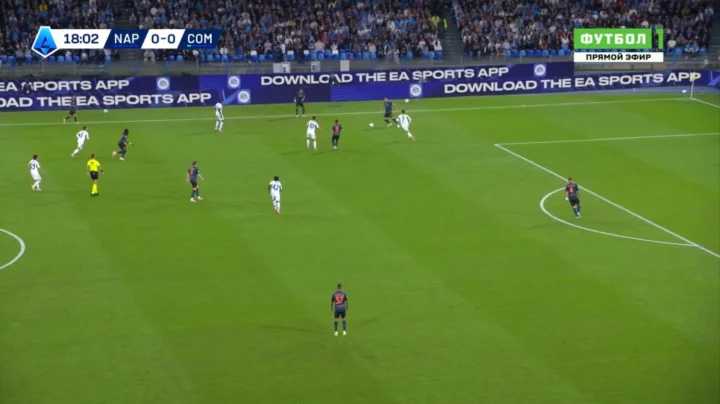 Con questa scelta, e senza alcuna possibilità di giocare in profondità – anche questo è un merito da ascrivere al Como, che nel primo tempo ha tenuto il baricentro a 51 metri –, è come se il Napoli si fosse precluso la possibilità di risalire il campo in maniera veloce sulla destra, quindi di sfruttare i giochi a tre tra lo stesso Politano, Di Lorenzo e Anguissa. Non a caso, viene da dire, all’intervallo David Neres aveva giocato più palloni (20) rispetto a Politano (16), e a fine partita è risultato che il Napoli ha costruito più azioni sulla sinistra (42%) che sulla destra (30%). Di solito questi rapporti sono esattamente ribaltati.
