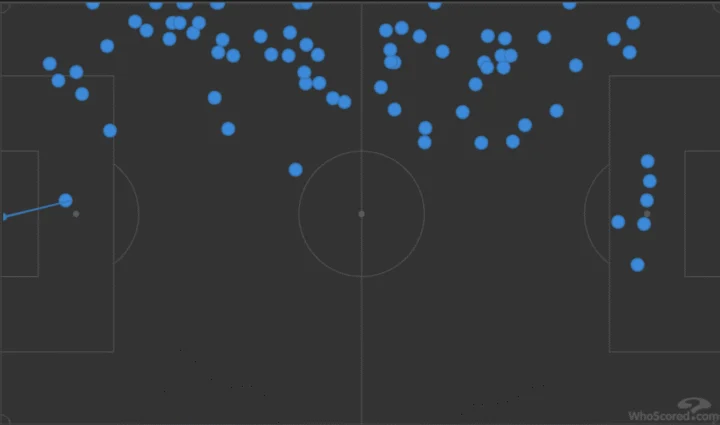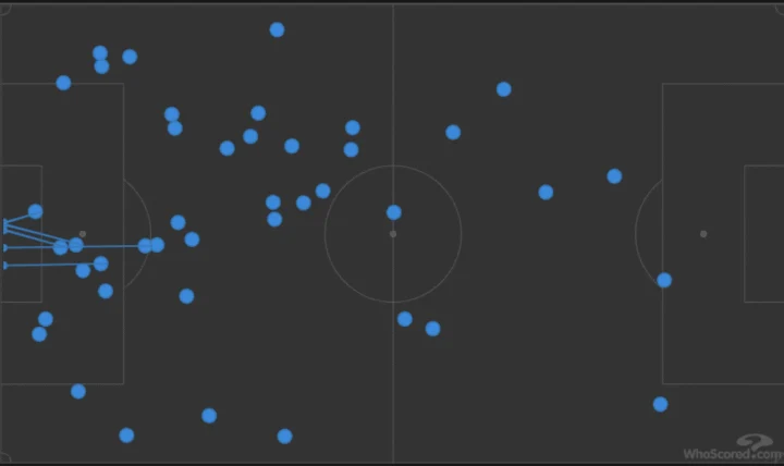 Questa mappa dice tantissimo sull’importanza di Hojlund, un’importanza ormai capitale, nell’economia del gioco del Napoli. Se la distribuzione spaziale non vi bastasse, sappiate anche che il centravanti danese ha toccato ben 43 palloni, un dato altissimo per una prima punta moderna. Soprattutto se pensiamo ai continui attacchi profondi, ai ripetuti scatti per allungare o allargare la difesa avversaria.