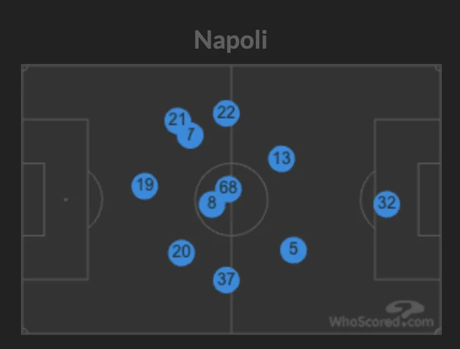 Nei primi due frame, si vede chiaramente la fase d’impostazione del Napoli con due centrali e due terzini larghi. Sopra, invece, trovate le posizioni medie dei giocatori azzurri durante il match contro la Cremonese.