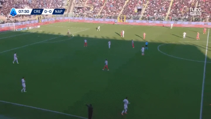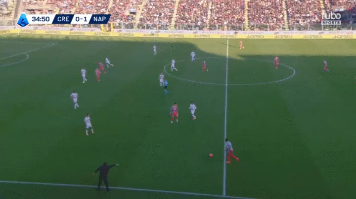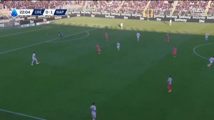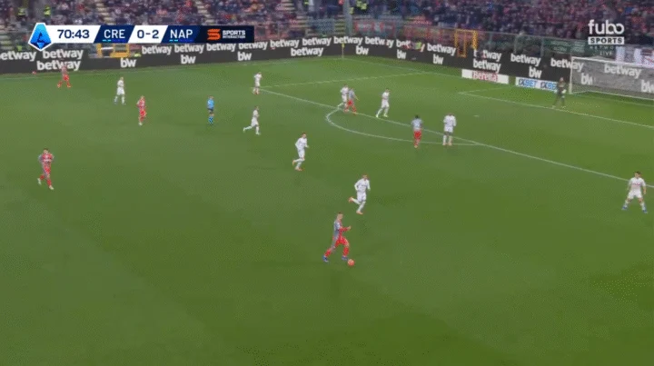 Riguardo la partita di Cremona, per esempio, si potrebbe dire che gli azzurri non abbiano davvero giocato con una difesa a tre, ma con un reparto arretrato composto solo da due uomini, Rrahmani e Juan Jesus. Di Lorenzo, infatti, ha interpretato il ruolo di braccetto in modo ambizioso e offensivo, con duetti e interscambi costanti con Politano e con Neres, con percussioni palla al piede, con tocchi ordinati per far salire la squadra.