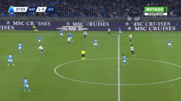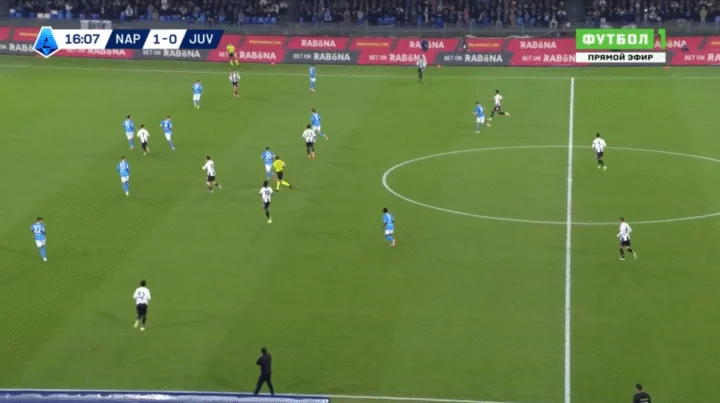 Dopo l’ottimo inizio e il vantaggio del Napoli, si è determinata una partita abbastanza semplice da leggere: la squadra di Conte continuava a essere aggressiva grazie a marcature a uomo puntuali, intelligenti, funzionali, marcature che la Juventus provava a forzare facendo retrocedere spesso Yildiz e Conceição per cucire il gioco. Una volta sopravanzato il primo pressing, però, la squadra bianconera si ritrovava di fronte un doppio muro compattissimo e neanche così schiacciato verso la propria area: il 5-4-1/5-3-2 difensivo del Napoli, infatti, spesso rimaneva in blocco medio-basso, senza arretrare troppo, in modo che la squadra azzurra potesse controllare agevolmente il gioco.