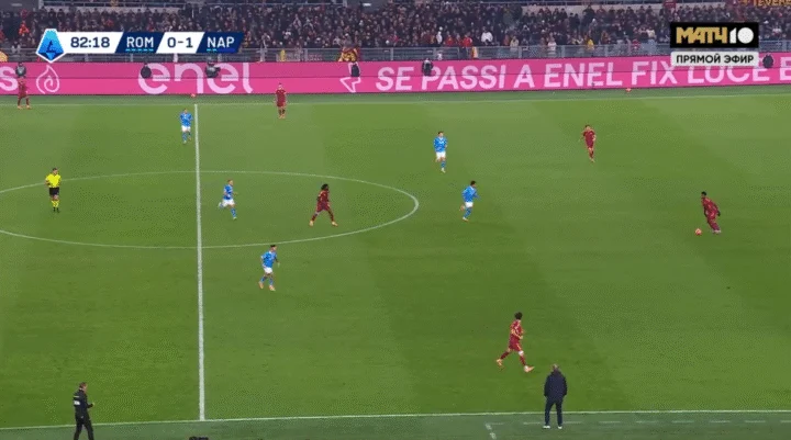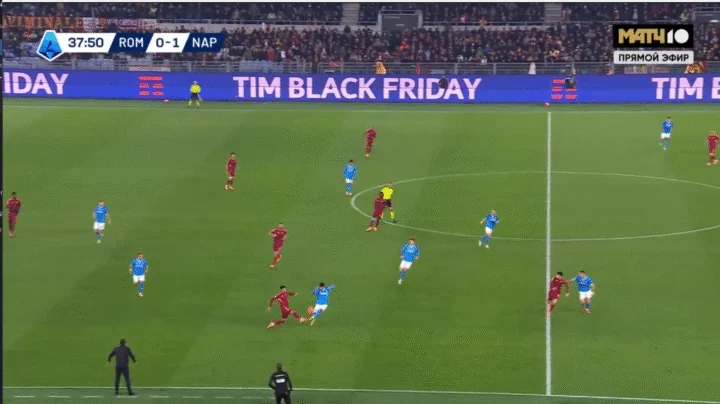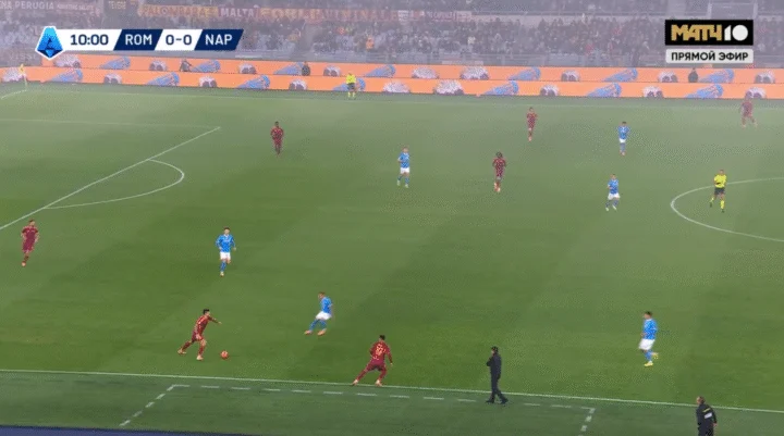 Più che gli accoppiamenti duri e puri, però, bisogna analizzare la ferocia, la costanza, la velocità con cui i giocatori del Napoli andavano ad aggredire quelli della Roma. Lo hanno fatto a tutto campo, in modo asfissiante, senza lasciargli modo e tempo di imbastire azioni offensive degne di questa definizione. In questo senso, i numeri del primo tempo sono a dir poco indicativi: la Roma è andata al riposo con un solo tiro in porta, scoccato da Mancini (!) sugli sviluppi di una rimessa laterale (!!). La squadra di Gasperini ha tenuto il pallone per il 40% del tempo, ha vinto solo il 33% dei contrasti (10 su 30) tentati contro il 67% del Napoli e, nonostante tutto questo, ha messo insieme la metà delle chiusure difensive (7-15) rispetto agli azzurri.