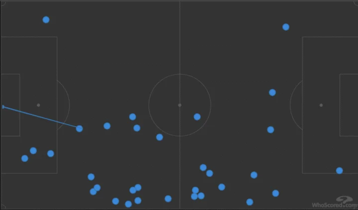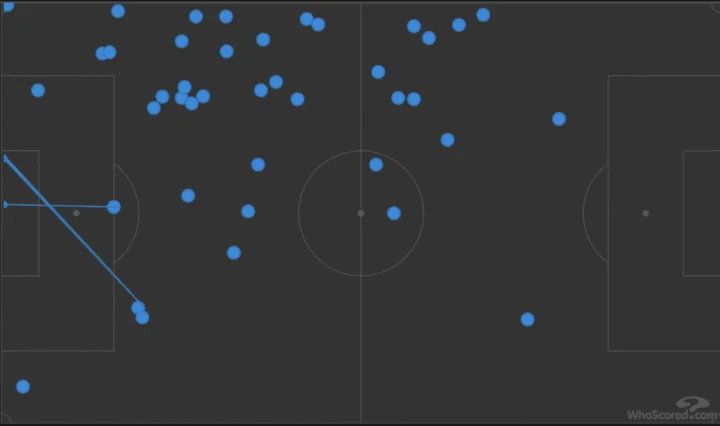 In alto, tutti i palloni giocati da Lang fino al momento della sua uscita dal campo, al minuto 71′. Sopra, invece, vediamo tutti i palloni giocati da David Neres fino al minuto 71′.
