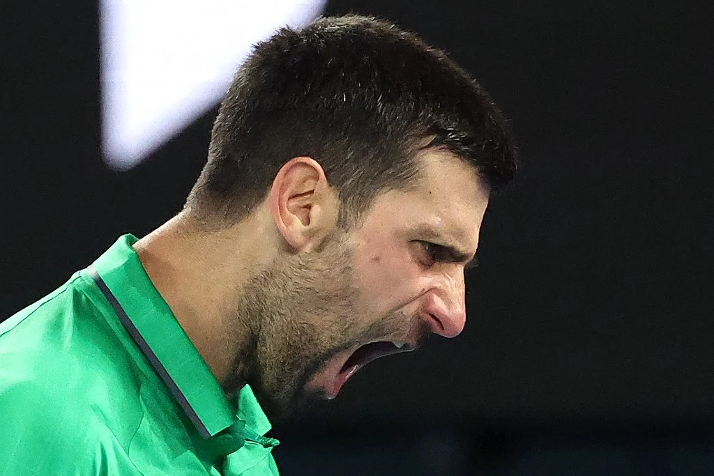 Serbia's Novak Djokovic reacts on a point to Italy's Jannik Sinner during their men's singles semi-final match on day thirteen of the Australian Open tennis tournament in Melbourne on January 31, 2026. (Photo by DAVID GRAY / AFP)