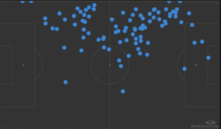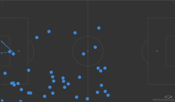 Nei primi due frame, vediamo Elmas e Cataldi uno attaccato all’altro (nel cerchio azzurro). Sopra, invece, c’è la mappa di tutti i palloni giocati dal giocatore macedone del Napoli.