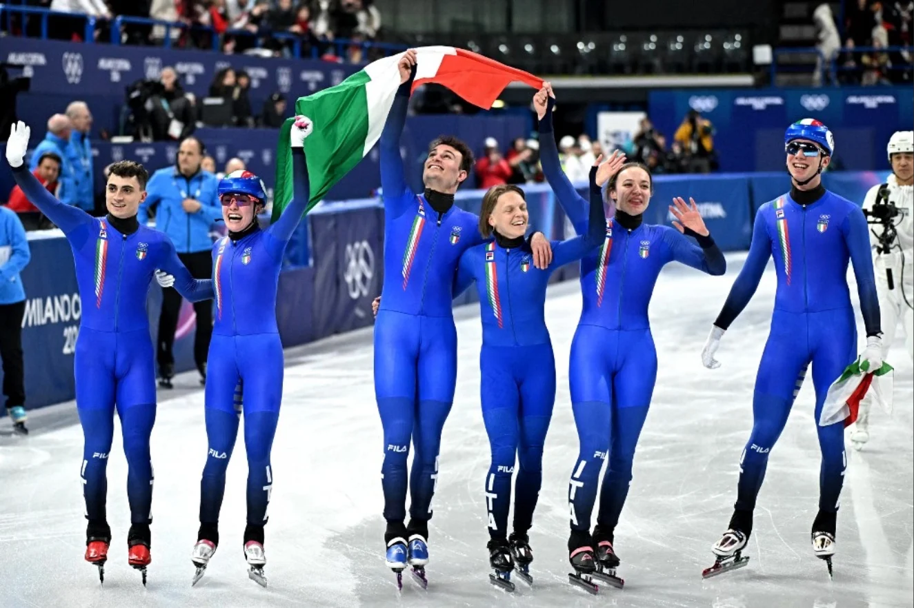Team Italy celebrate after winning gold in the short track speed skating mixed team relay final during the Milano Cortina 2026 Winter Olympic Games at Milano Ice Skating Arena in Milan on February 10, 2026. Gabriel BOUYS / AFP