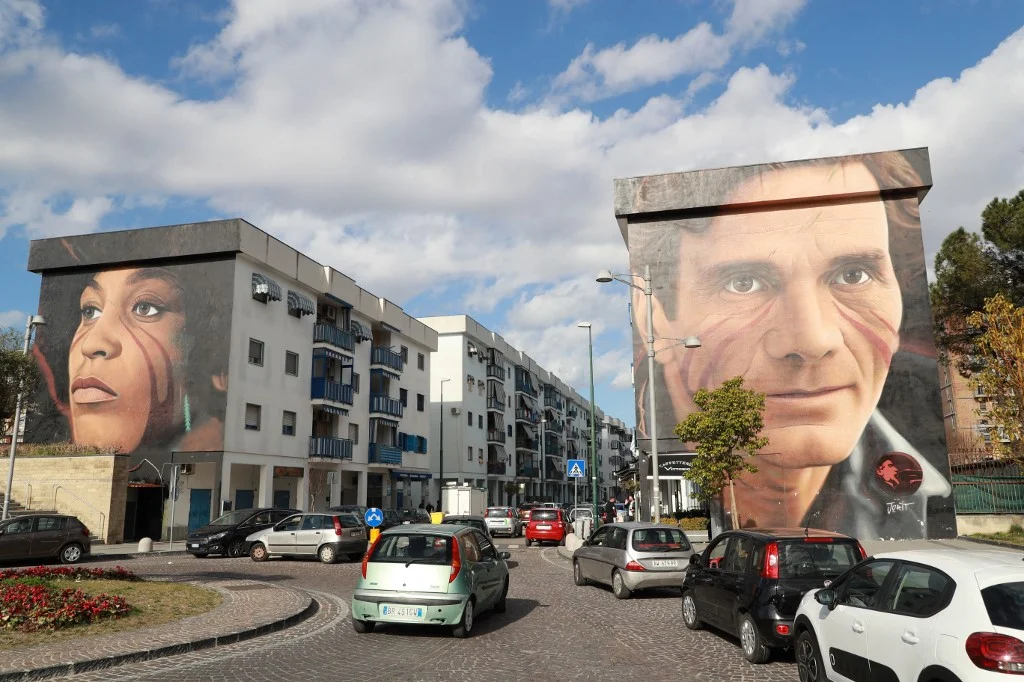 A picture taken on Febuary 28, 2020 shows giant murals by the street artist Jorit Agoch, depicting US activist Angela Davis (L) and Italian writer and director Pier Paolo Pasolini on buildings at the entrance of Scampia, a district of Naples. (Photo by Ludovic MARIN / AFP) / RESTRICTED TO EDITORIAL USE - MANDATORY MENTION OF THE ARTIST UPON PUBLICATION - TO ILLUSTRATE THE EVENT AS SPECIFIED IN THE CAPTION