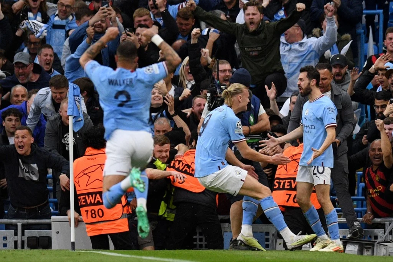 Manchester City's Portuguese midfielder Bernardo Silva (R) celebrates scoring the opening goal with Manchester City's Norwegian striker Erling Haaland (C) during the UEFA Champions League second leg semi-final football match between Manchester City and Real Madrid at the Etihad Stadium in Manchester, north west England, on May 17, 2023. (Photo by Oli SCARFF / AFP)