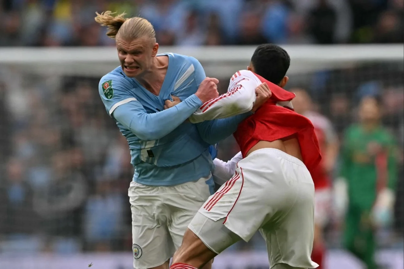 Manchester City's Norwegian striker #09 Erling Haaland (L) fights with Arsenal's French defender #02 William Saliba (R) during the English League Cup final football match between Arsenal and Manchester City at Wembley Stadium in London on March 22, 2026.